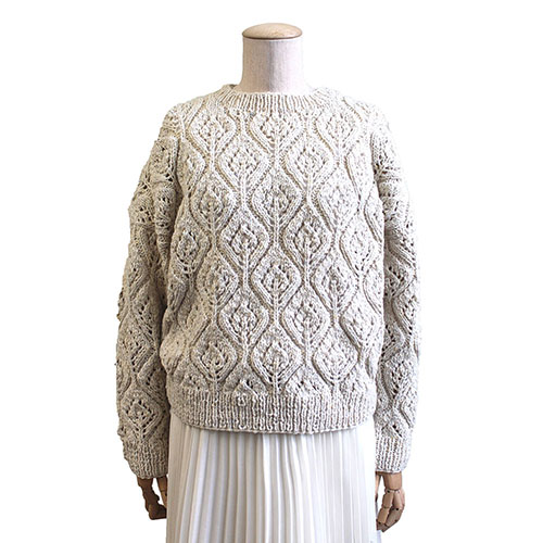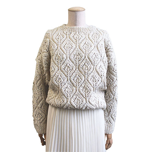 ザクザクとゆったりゲージで編んだ葉っぱ模様が新鮮なセーター。