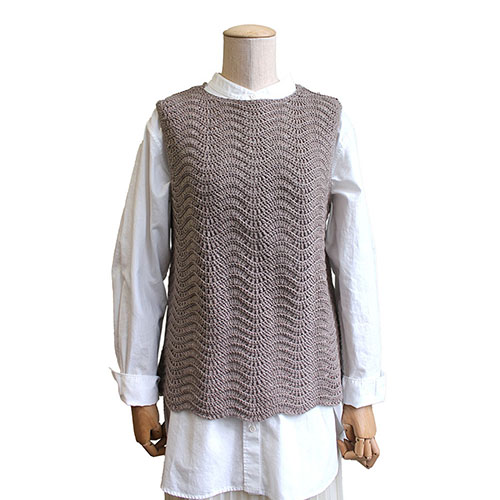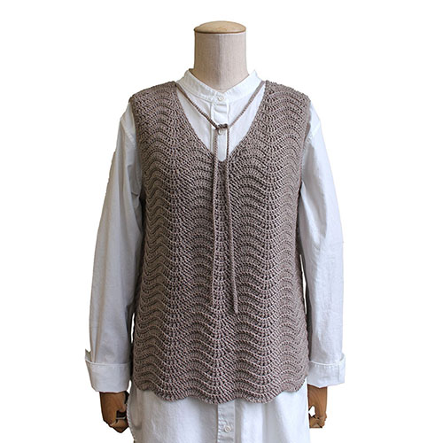 シェブロン模様とよばれる波打つ様な柄が美しいベストです。衿の飾り紐がさり気ないアクセントになっています。