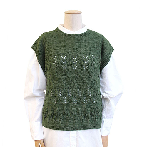 まるで森の中にいるような心地よい豊かなグリーンのベストです。4つの模様楽しみながら編み進んで頂けます。