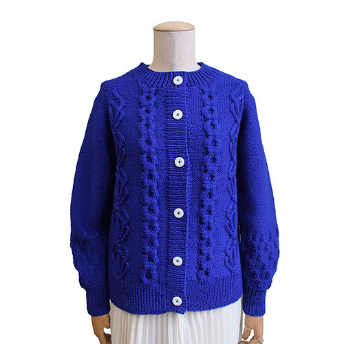 鮮やかなブルーに白いボタンを効かせたアラン模様のカーディガンです。
