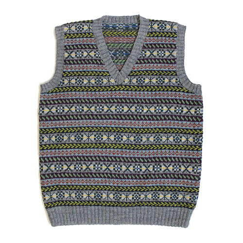 12色の豊かな色が使われている編み込みのメンズベストです。