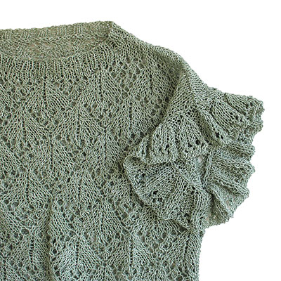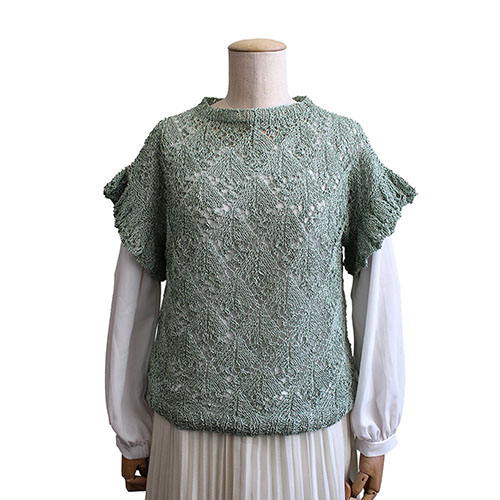 身頃のダイヤ模様の透かし編みに、優しいフリルのフレンチスリーブを組み合わせた可愛いプルオーバーです。澄んだグリーンがとても爽やかな印象です。