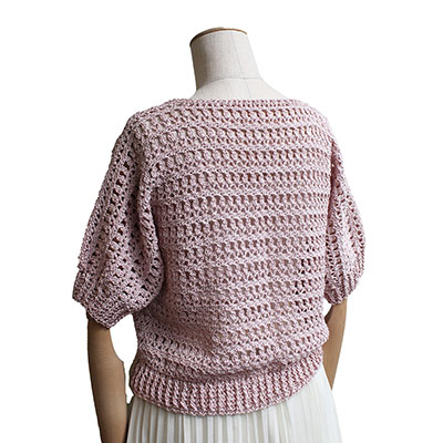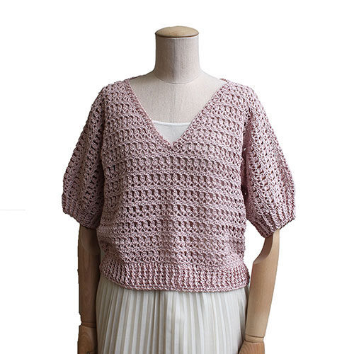 身頃と袖を続けて肩までまっすぐ編みます。 袖は縁編みを編むことでふっくらとしたシルエットになり、気になる腕まわりをカバーしてくれます。 素 材:コットン40% レーヨン40% リネン20% 使用針:かぎ針6/0号 サイズ:胸囲94cm 着丈45.5cm 裄丈44.5cm ヨーロッパの手あみ掲載作品 * 同品種(フォッシュ)での、お色変更も可能です ご希望の場合は、コメント欄にお色変更の詳細を入力してください(在庫がある色に限ります)