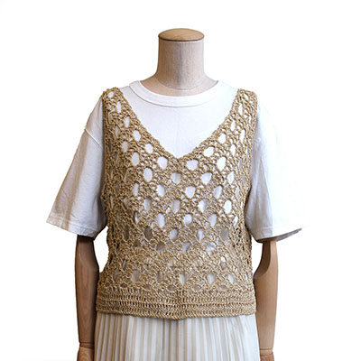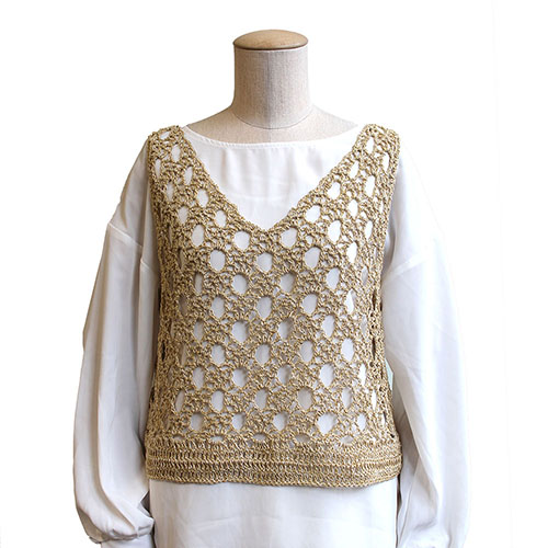 夏気分を満喫できるキャミソールは前後同じ形に編み、縁編み無しで完成です。