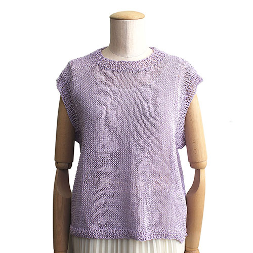 メリヤス編みのシンプルベストは、爽やかで優しいパープルをチョイス。