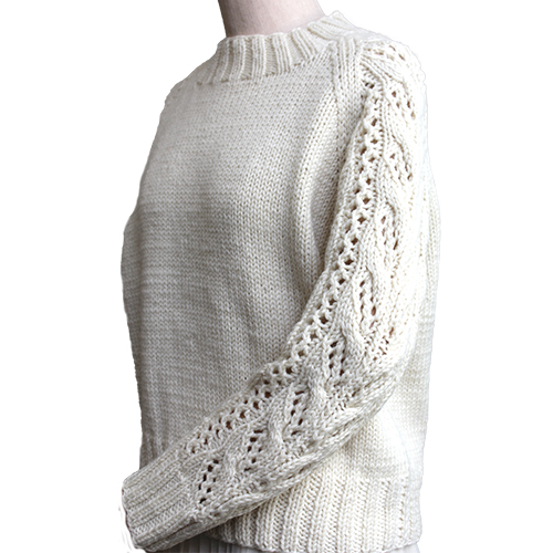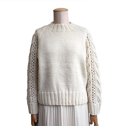 定番のラグランセーターの袖をレース模様にして、オリジナル感をアップ! メリヤス編みのスッキリ身頃とのバランスが絶妙な1着です。 素 材:ウール100% 使用針:棒針11号 サイズ:胸囲100cm 着丈53.5cm 裄丈69.5cm ヨーロッパの手あみ掲載作品 * 同品種(リンカントno.9)での、お色変更も可能です ご希望の場合は、コメント欄にお色変更の詳細を入力してください(在庫がある色に限ります)