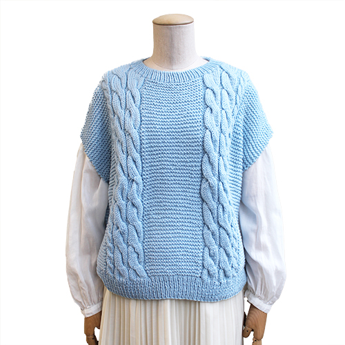 ガーター編みベースに大小2種類のケーブルがポイントのドロップショルダーのセーター。 大きめシルエットと相性良しのストンとした落ち感がきれいです。 素材:ウール100% 使用針:棒針7号 サイズ:胸囲100cm 着丈54cm 裄丈25cm ヨーロッパの手あみ掲載作品 * 同品種(クイーンアニー)での、お色変更も可能です ご希望の場合は、コメント欄にお色変更の詳細を入力してください(在庫がある色に限ります)