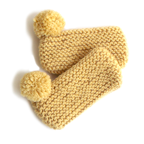 ガーター編みで四角に編み、とじ合わせてポンポンをつけるだけなので初心者さんにもおすすめしたいアイテムです
