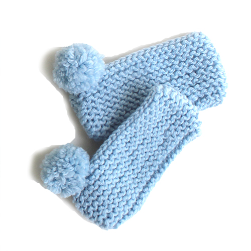 ガーター編みで四角に編み、とじ合わせてポンポンをつけるだけなので初心者さんにもおすすめしたいアイテムです
