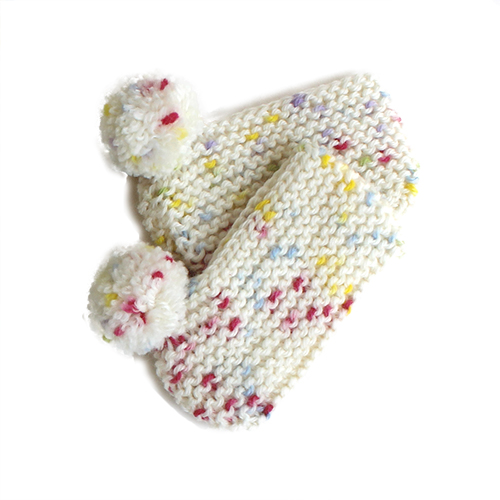 ガーター編みで四角に編み、とじ合わせてポンポンをつけるだけなので初心者さんにもおすすめしたいアイテムです