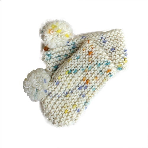 ガーター編みで四角に編み、とじ合わせてポンポンをつけるだけなので初心者さんにもおすすめしたいアイテムです