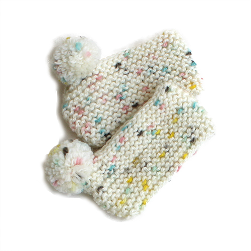 ガーター編みで四角に編み、とじ合わせてポンポンをつけるだけなので初心者さんにもおすすめしたいアイテムです