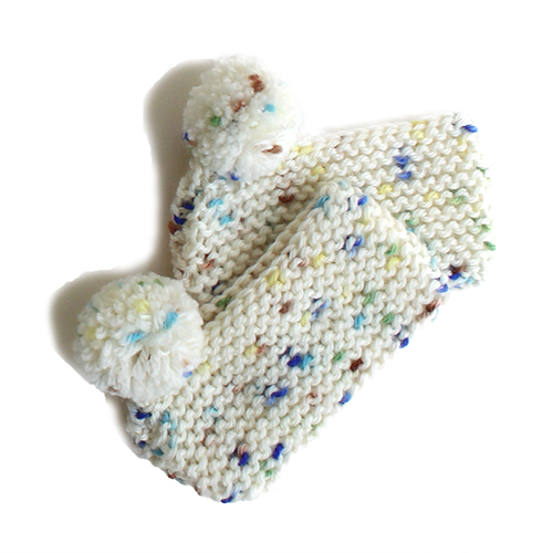 ガーター編みで四角に編み、とじ合わせてポンポンをつけるだけなので初心者さんにもおすすめしたいアイテムです