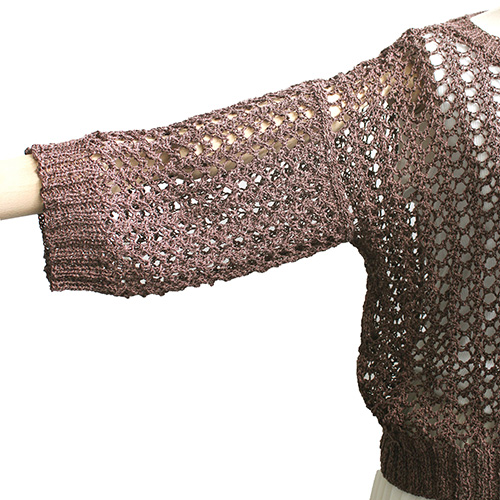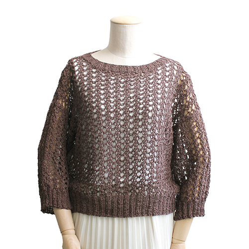 ドライブ編みの大きな穴あき模様が夏気分。 季節感のあるアイテムを編むあいだ、どの服と合わせようか、どこに着て行こうかとあれこれ考えるのは至福の時間です。 素 材:コットン40% レーヨン40% リネン20% 使用針:棒針6号 サイズ:胸囲102cm 着丈51cm 裄丈54cm ヨーロッパの手あみ掲載作品 * 同品種(フォッシュ)での、お色変更も可能です ご希望の場合は、コメント欄にお色変更の詳細を入力してください(在庫がある色に限ります)