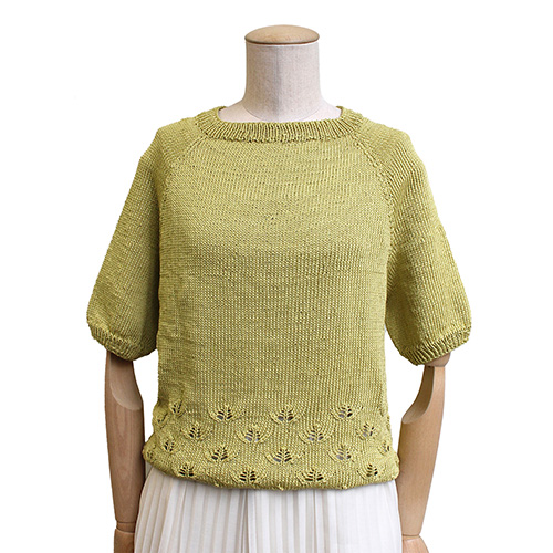トップダウンで編むシームレスな半袖プルオーバーは、花にも葉にも見える、手を広げたような模様がピースフル。 艶感と張りのある、上質コットンの質感を愉しんで。 素 材:コットン100% 使用針:棒針5号 かぎ針5/0号 サイズ:胸囲90cm 着丈51cm 裄丈45cm ヨーロッパの手あみ掲載作品
