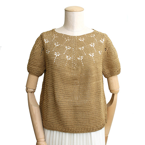 “幸せをもたらすもの”として縁起が良いといわれるトンボをモチーフにした長編みプルオーバー。