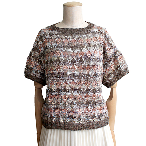 2種類の糸を3色組み合わせて縞に編み、引き出し編み目で花のような模様を作ります。