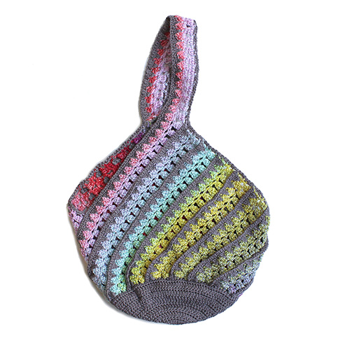 模様を活かして片側で増し目をしながら、持ち手部分も一緒に編んでいくデザインが面白いバッグです。