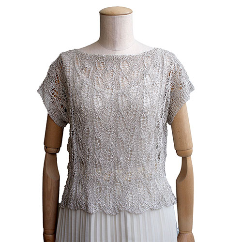 繊細なラメ糸を使った涼し気なレースのセーター。 新芽が上に上に向かって伸びるような模様が印象的です。 素 材:リネン53% シルク40% ポリエステル7% 使用針:棒針5号 サイズ:胸囲100cm 着丈50cm 裄丈28cm * 書籍には掲載されていないパピー企画室オリジナル作品です * 同品種(シルクスピンラメ)での、お色変更も可能です ご希望の場合は、コメント欄にお色変更の詳細を入力してください(在庫がある色に限ります)