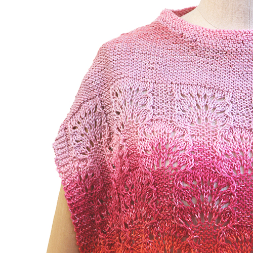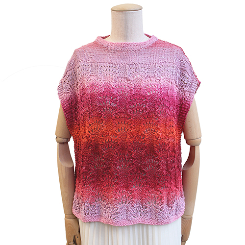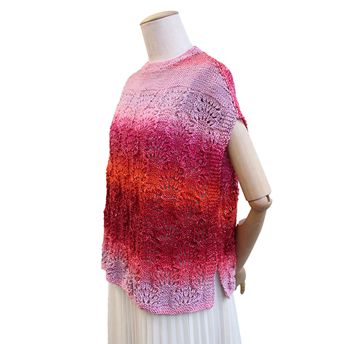 キュートなレッドピンク系のグラデーションのお花模様が華やぐのレース編みセーターです。 ゆったりとした身幅となだらかなショルダーライン、ネックから少し立ち上がりのある衿など、着用したときのキレイポイントが一杯!