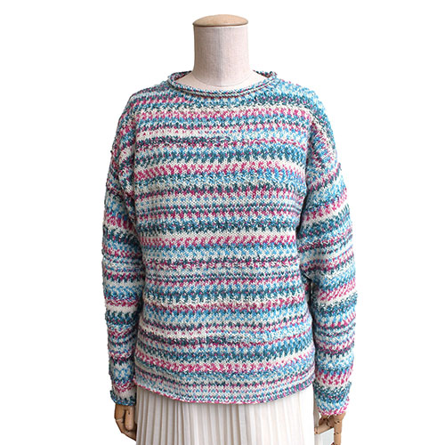 1本の糸をただ編むだけで、絶妙な配色のフェアアイル風編み込み模様が編めてしまう、魔法の毛糸。編み物ビギナーでも技ありニットの夢が叶います。 素材:ウール75% ナイロン25% 使用針:棒針7号 サイズ:胸囲98cm 着丈56cm 裄丈72cm ヨーロッパの手あみ掲載作品 * 同品種(ルレット)での、お色変更も可能です ご希望の場合は、コメント欄にお色変更の詳細を入力してください(在庫がある色に限ります)