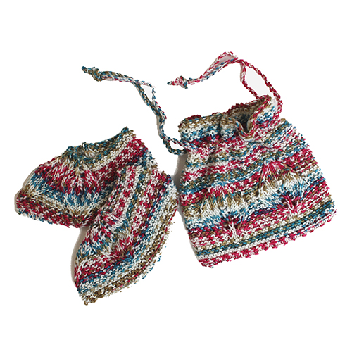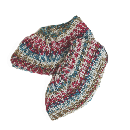 短いピッチの段染め糸とガーター編みの出会いが生んだ、さり気ないリーフ模様がポイントのルームシューズ。
