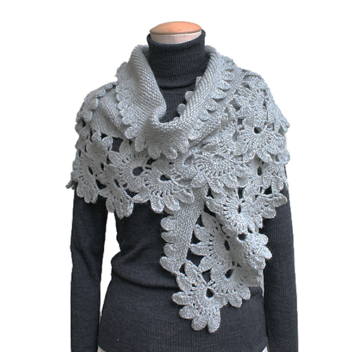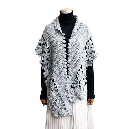 本体はガーター編みでシンプルに編み、縁回りにかぎ針で花模様を編みつけます。 素 材:ウール72%(ラムズウール100%使用)アンゴラ10% ナイロン10% シルク8% 使用針:棒針6号 かぎ針6/0号 サイズ:幅約75cm 長さ約100cm * 書籍には掲載されていないパピー企画室オリジナル作品です * 同品種(トルメンタ)での、お色変更も可能です ご希望の場合は、コメント欄にお色変更の詳細を入力してください(在庫がある色に限ります)