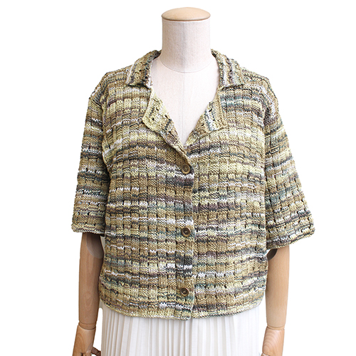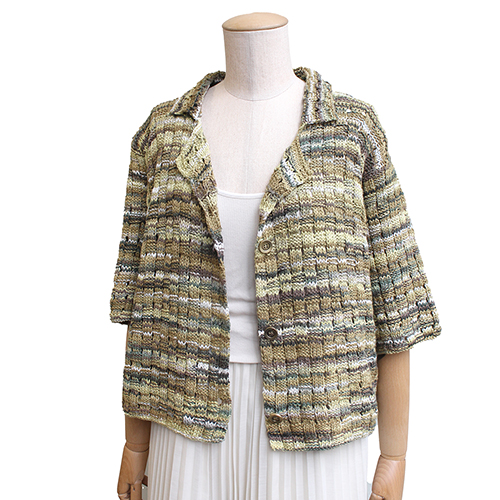 アースカラーのきれいなグラデーションに癒される、五分袖のカーディガンジャケット。 かけ目の効いた組み合わせが軽やかな、バスケット模様が目を惹きます。 素 材:コットン100% 使用針:棒針7号 サイズ:胸囲99cm 着丈56.5cm 裄丈49.5cm ヨーロッパの手あみ掲載作品 * 同品種(アゲート)での、お色変更も可能です ご希望の場合は、コメント欄にお色変更の詳細を入力してください(在庫がある色に限ります)