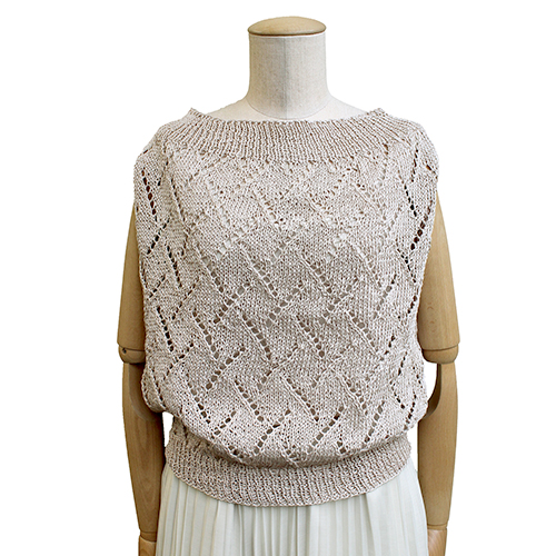四角く編んだ身頃の終わりを、そのまま拾った広めのボートネックがクール。 心地よい肌触りのコットンリネンを2本どりにして、ざっくりと編んだデザインです。 素 材:コットン61% リネン39% 使用針:棒針7号 5号 サイズ:胸囲100cm 着丈50cm 裄丈25cm ヨーロッパの手あみ掲載作品 * 同品種(サン・ジル)での、お色変更も可能です ご希望の場合は、コメント欄にお色変更の詳細を入力してください(在庫がある色に限ります)