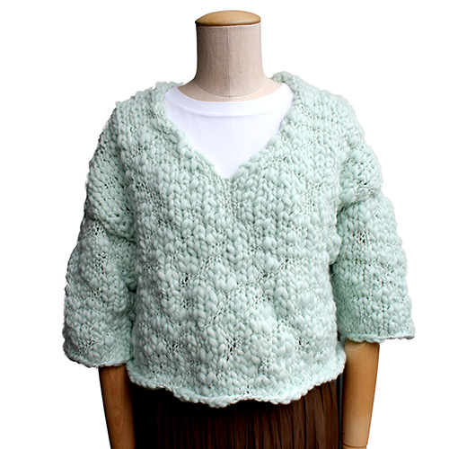 ホイップクリームのような、ふっくらスラブヤーンは肌触り良く、脇&袖下は輪に編むのでとじ代なし