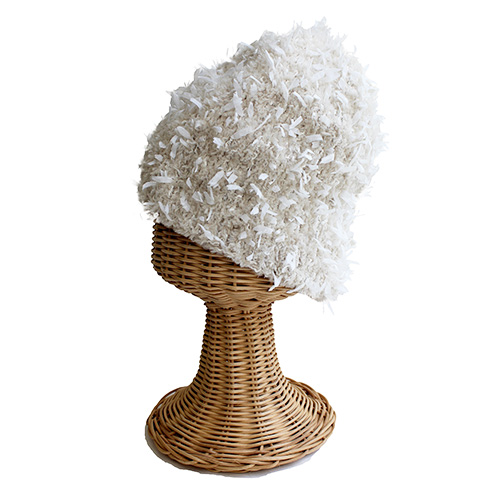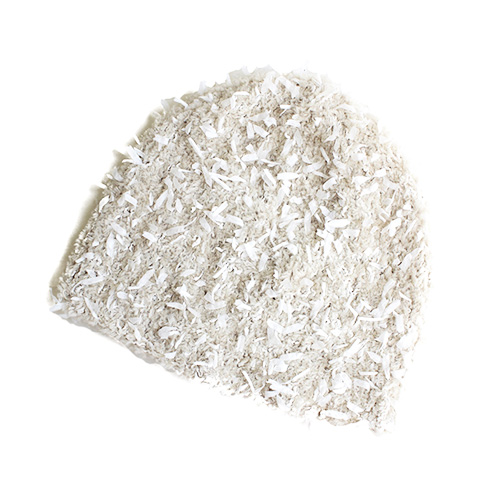 ふわふわのファーヤーンと、ひらひらとしたリボンヤーンを引き揃えて編んで華やかに