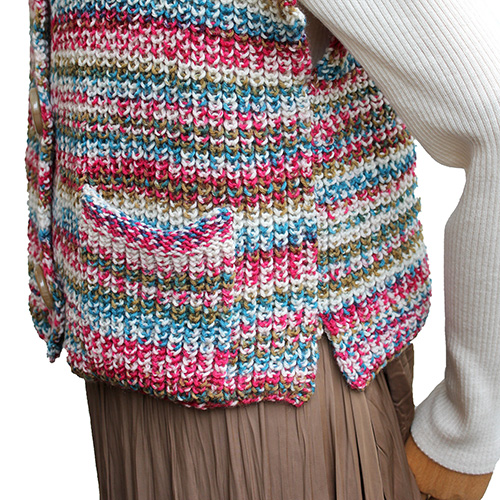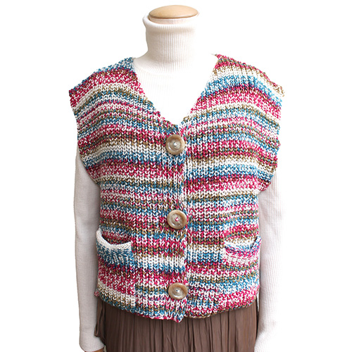 編みこみのような段染めとイギリスゴム編みの立体感が合わさったコンパクトなベストです。シンプルな形に大きめのボタンと小さなポケットがアクセントになっています。