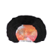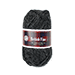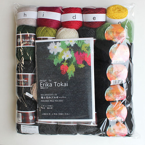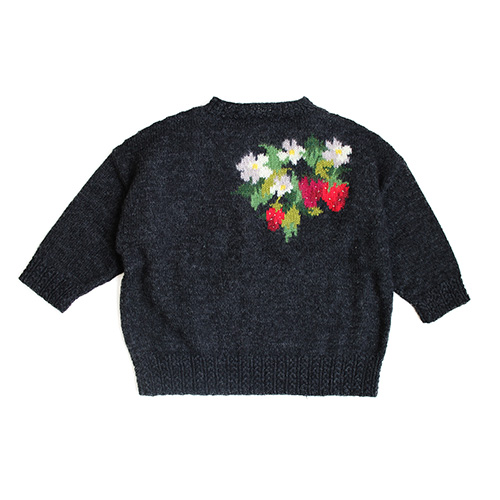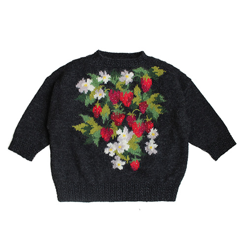 チャコールグレーのストレートヤーンと黒色のモヘアを引き揃えたシックな杢調のベースヤーンに、赤い苺と白い花を編み込みました