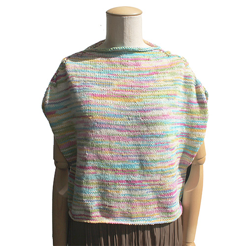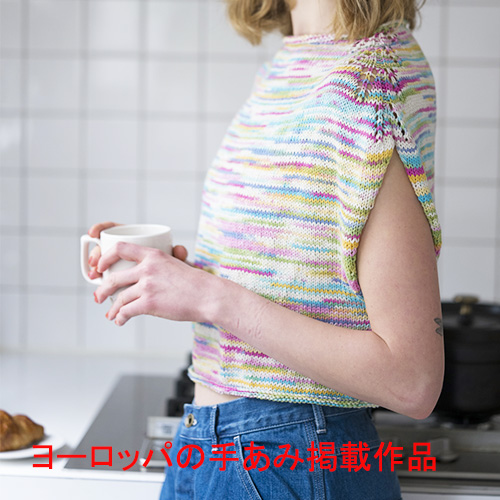肩の透かし編みがポイントのトップダウンニットは、とじはぎいらずの編みっぱなし仕様。 簡単に着丈を好きな長さに変えられるのも魅力です。 今夏の気分は、スタイル良く見えるすっきりとしたクロップド丈で。 素 材:コットン100% 使用針:棒針7号 サイズ:胸囲100cm 着丈49cm 裄丈30.5cm ヨーロッパの手あみ掲載作品 * 同品種(アゲート)での、お色変更も可能です ご希望の場合は、コメント欄にお色変更の詳細を入力してください(在庫がある色に限ります)