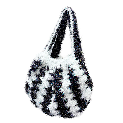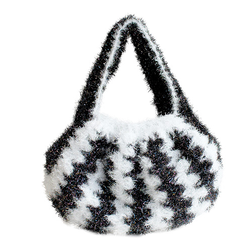 2色をかぎ針編みで縞に四角く編み、周りはギャザーを寄せて縁や持ち手を作ります。