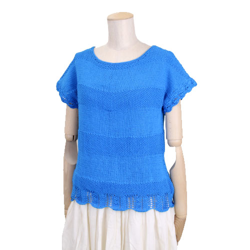 かのこ編みをメリヤス編みのボーダー柄のフレンチプルオーバー。裾のスカラップがポイント。 サイズ:胸囲86cm 着丈51cm 裄丈27cm ヨーロッパの手あみ掲載作品 * 同品種(コットンコナ)での、お色変更も可能です ご希望の場合は、コメント欄にお色変更の詳細を入力してください(在庫がある色に限ります)