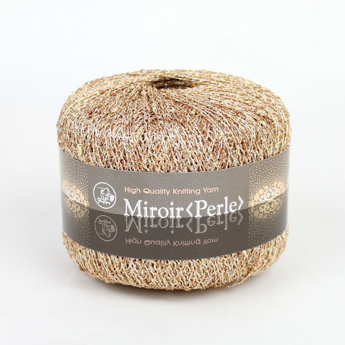 ミロワールのシリーズに新しいタイプが加わりました。「鏡」という意味のミロワールから連想されるキラキラ光るラメ糸を使い、ビーズの粒(フランス語で「ペルル」)のように見えるノットの糸を作りました。非常に細番手の糸なので、引き揃えて編む際のベースとなる糸の風合いを損なわず、繊細で上品な煌めきの編地に仕上がります。太さは超極細です。