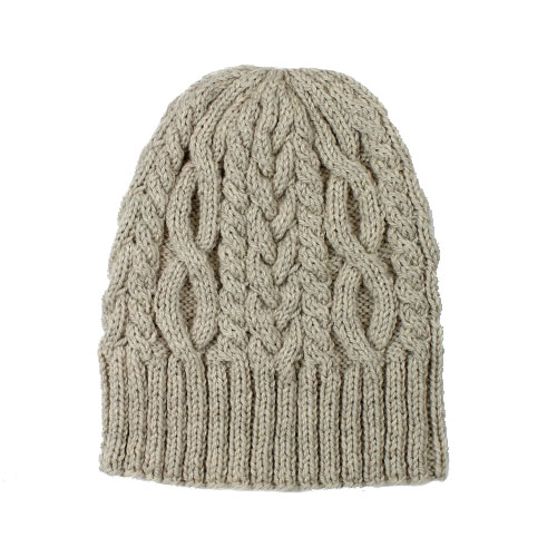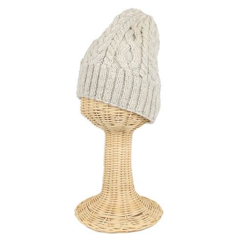 帽子ひとつでブリティッシュスタイルを演出できるアラン模様はコントラストの強いシックな色で、柄を際立たせて。