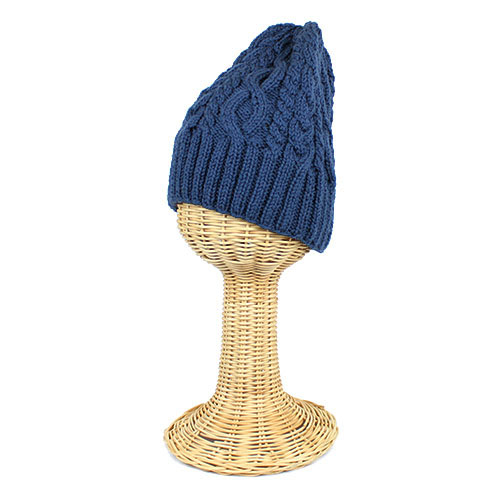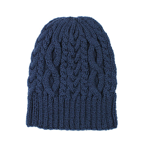 帽子ひとつでブリティッシュスタイルを演出できるアラン模様はコントラストの強いシックな色で、柄を際立たせて。