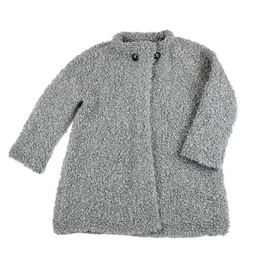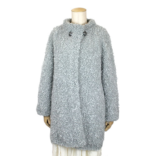 ループの表情が豊かなタップリ丈のコートです。パピー発:手編みの本 Vol.13 掲載作品 素材:モヘヤ 80% ウール 20% 使用針:棒針12号・11号 サイズ:胸囲98cm 着丈71cm 裄丈69cm