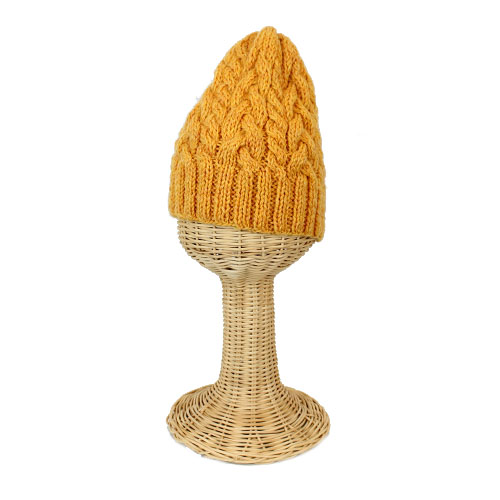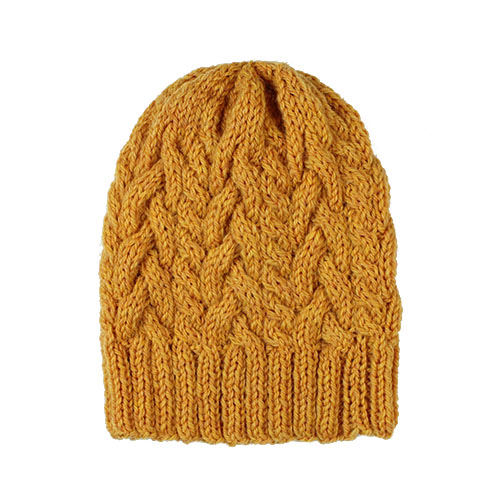 ケーブルとバスケット柄で編んだ アラン模様の帽子は手編みらしさがタップリの冬の定番です。