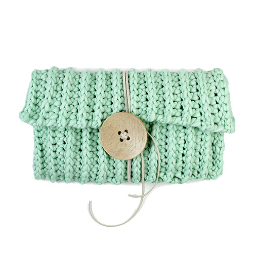 ガーゼタッチの太糸をかぎ針あみでざっくり編んだクラッチバッグです、優しいミントグリーンにココナッツ素材の白く大きなボタンがアクセントに! 素材:コットン 100% 使用針:太かぎ針8mm サイズ:幅24cm 深さ12cm * こちらの作品は書籍には掲載されておりません * 同品種(フリー)での、お色変更も可能です ご希望の場合は、コメント欄にお色変更の詳細を入力してください(在庫がある色に限ります)