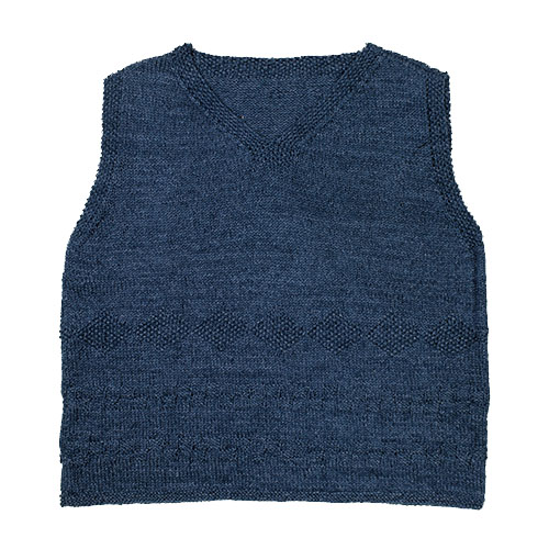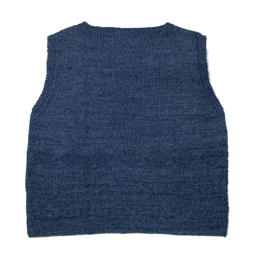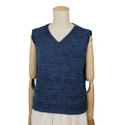 身頃と袖ぐり、衿ぐりを一緒に編んで仕上げるデザインです。デニムカラーを生かしたシンプルな地模様のベスト。 デニムに出逢うニット掲載作品 素材:コットン 100% 使用針:棒針4号 サイズ:胸囲96cm 着丈53cm 背肩幅38cm * 同品種(ピマデニム)での、お色変更も可能です ご希望の場合は、コメント欄にお色変更の詳細を入力してください(在庫がある色に限ります)