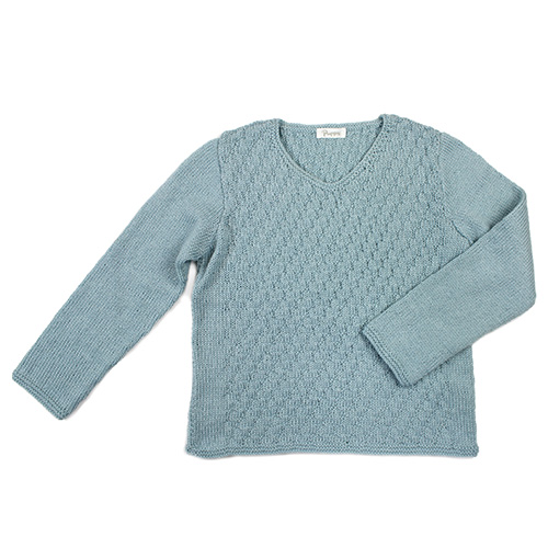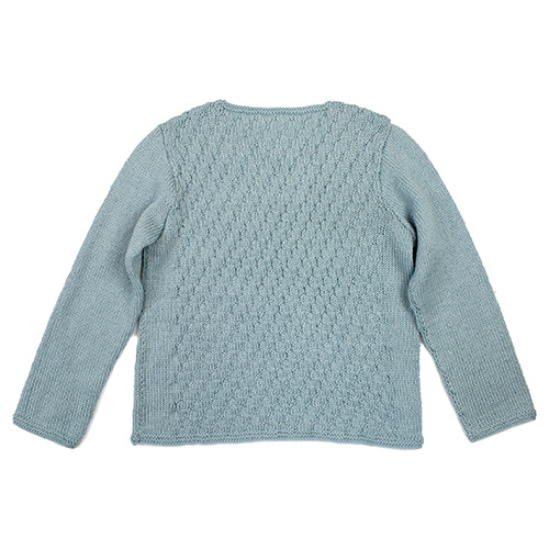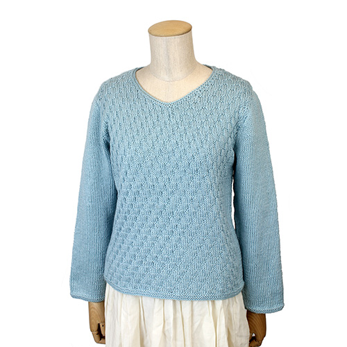 身頃は立体的な地模様、袖はスッキリとメリヤス編みの組み合わせのコントラストが効いています。 シルクの艶としなやかさを感じる手触りも魅力。 ヨーロッパの手あみ掲載作品 素材:ウール 58% モヘヤ 25% シルク 17% 使用針:棒針 7号 サイズ:胸囲90cm 着丈54cm 背肩幅34cm 袖丈52cm * 同品種(ボーボリ)での、お色変更も可能です ご希望の場合は、コメント欄にお色変更の詳細を入力してください(在庫がある色に限ります)