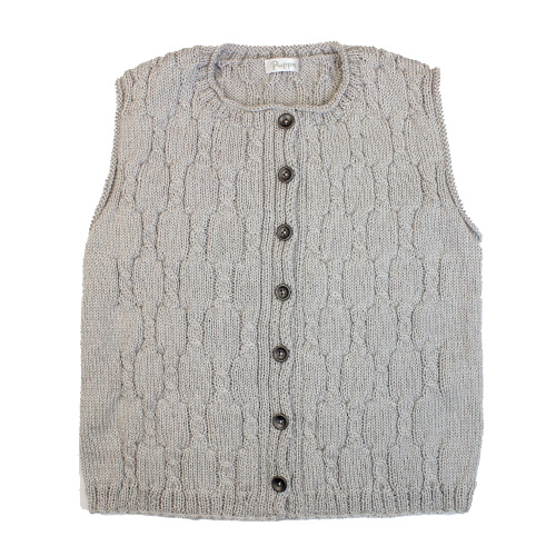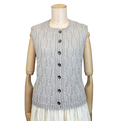 前立てが身頃と一緒に編んで仕上げます。サイドの部分のメリヤスが着用したときにシルエットをすっきりと見せます。今年注目のワインカラーです。
