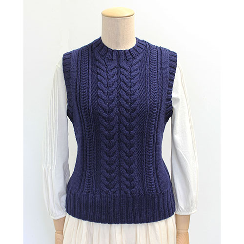 身頃に大小のケーブルを配した、ラウンドネックのマニッシュなベスト