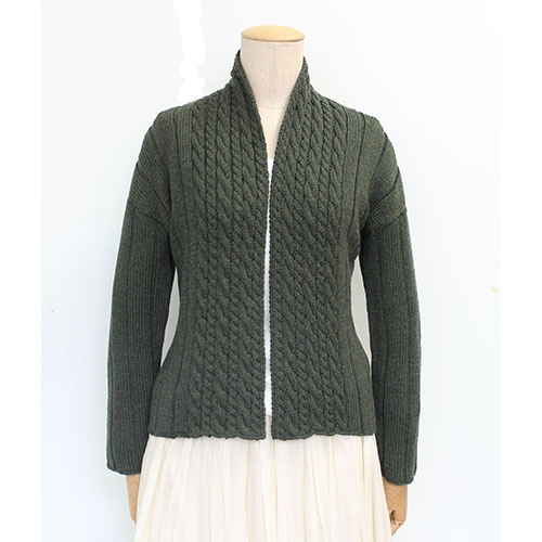 豊かなミックス感が魅力のディープグリーンのカーディガン。身頃から衿につながる模様は交差のリズムをかえた2種類のケーブルを交互に配しています。 エクストラファインメリノの心地よさを味わっていただける一着。