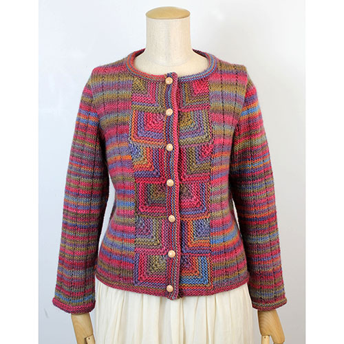 マルチカラーのロービングヤーンで編むエレガントなカーディガン。 前身頃の四角いモチーフは作り目と減目を繰り返して帯状に仕立てて身頃とつなぎます。