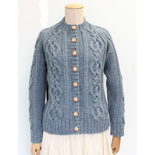 ラグランスリーブのアラン模様カーディガンはカジュアルな定番ジャケットです。 裏目をベースに複雑に絡むケーブル模様が編み心をそそります。