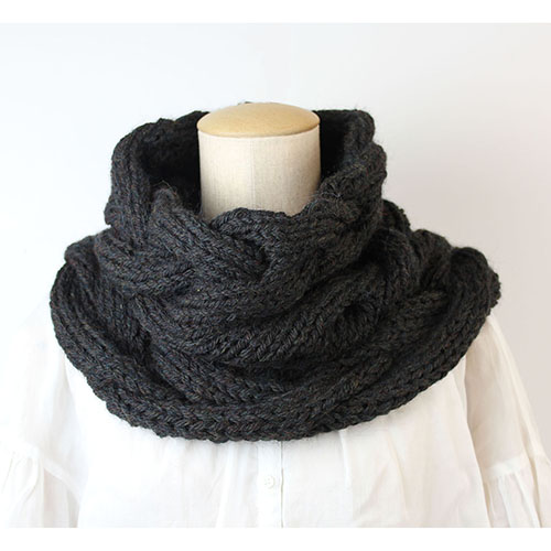 おもわず顔をうずめたくなる大ぶりのスヌードは、交差を入れる事で、波のようなうねり生み出します。 男性にすっかり定着したスヌードだが、男女で着用できる透明なデザイン。糸は2本取りで編みます。
